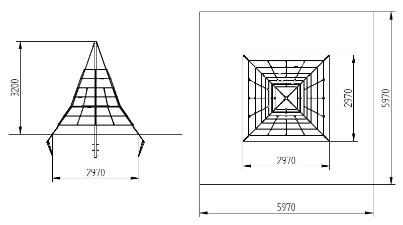 Pyramida se skládá z lanového pláště s ocelovým jádrem (průměr 16 mm), jednoho mezipatra pro odpočinek nebo přestup, a centrálního kotvícího stožáru, který zajišťuje stabilitu celé konstrukce. Lanová síť vytváří přehlednou a přístupnou trasu směrem vzhůru, kde si každé dítě zvolí vlastní tempo i cestu.